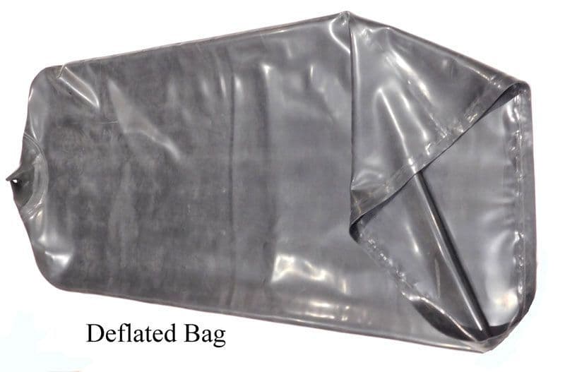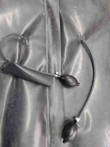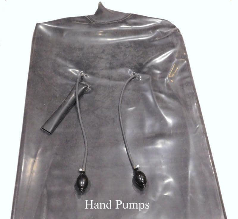 With inflation, the adventure begins, close the valves on the hand inflators and commence pumping to create air pressure between the two skins. While inflation may be accomplished with the hand pumps, the optional Battery Pump Kit provides a quicker alternative. As air pressure intensifies, the base of the bag will merge with the top and bottom layers, ensnaring the wearer in a skin-tight, latex rubber prison. Continue inflating until a partial vacuum is achieved within the bag, heightening the sensation of complete immobilisation.